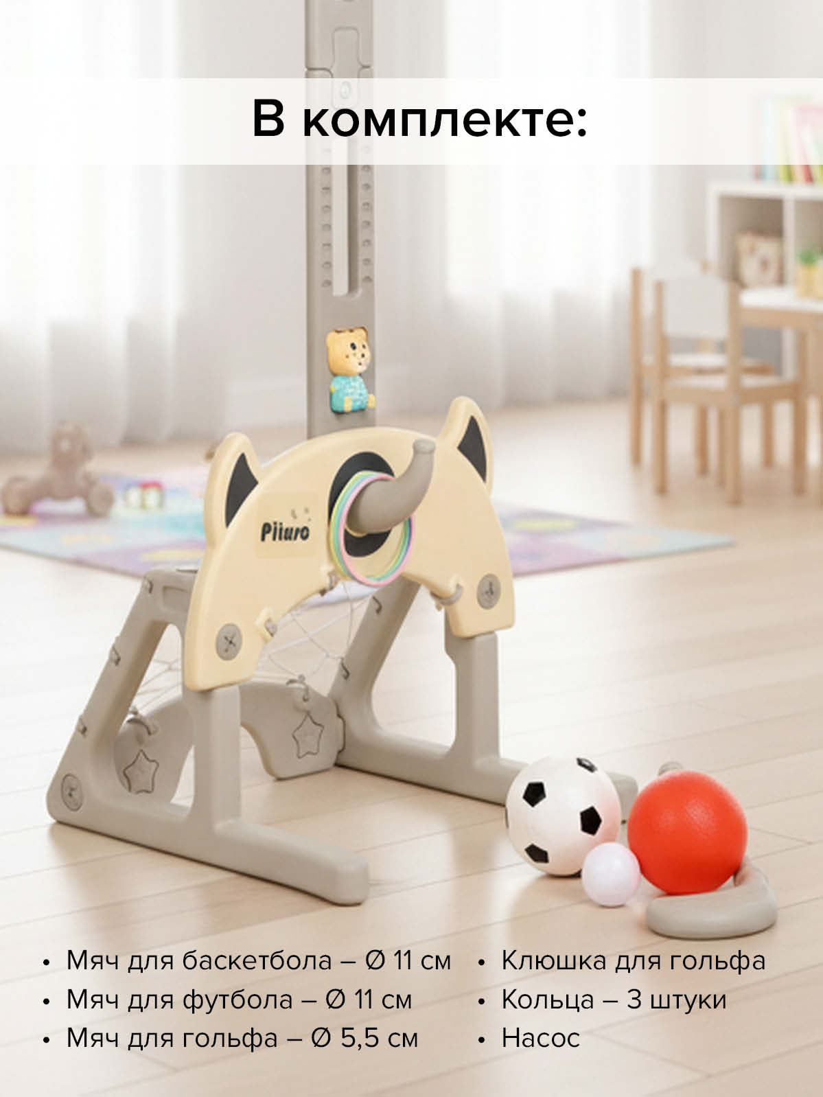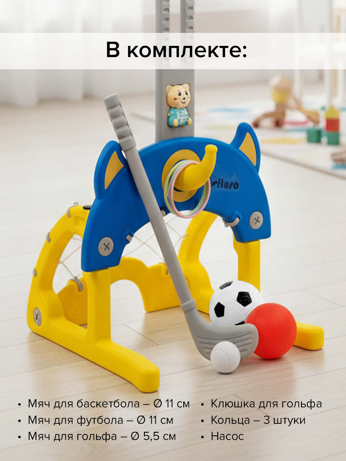 В комплект входят: мячи - 3 штуки (1-для гольфа, 1 (д.11см)-для баскетбола,1 (д.11см)-для футбола), клюшка для гольфа, кольца– 3 штуки).