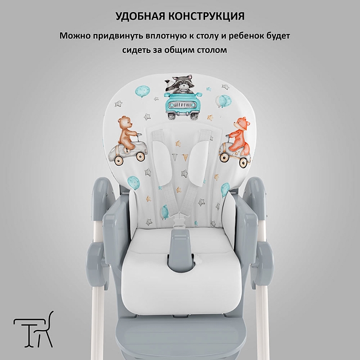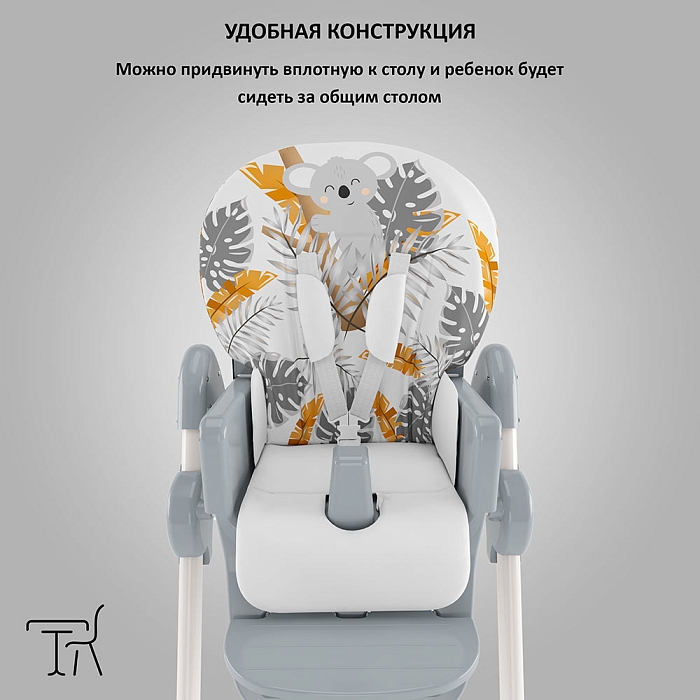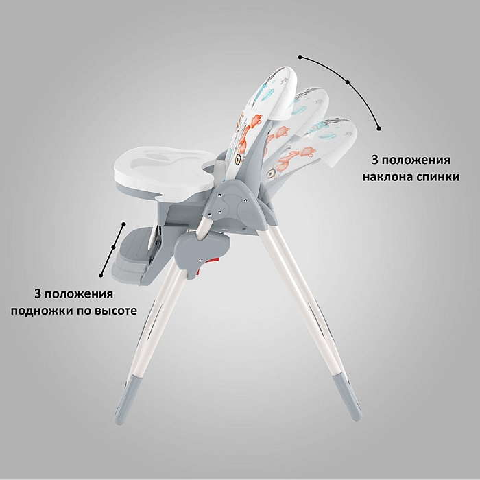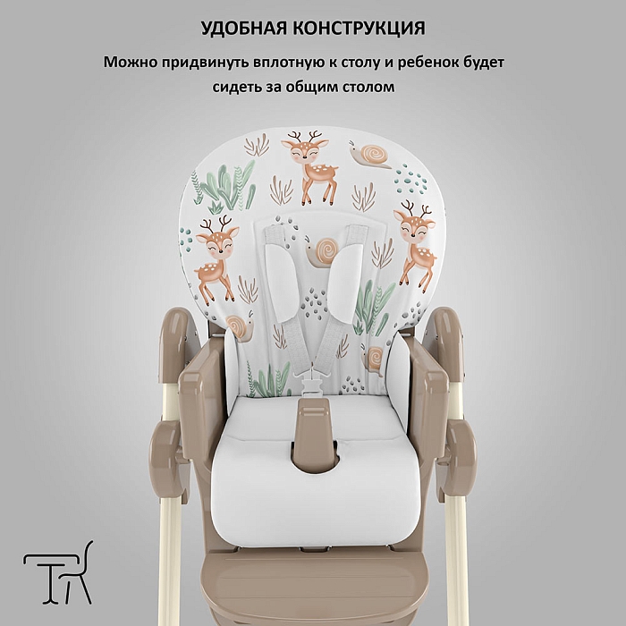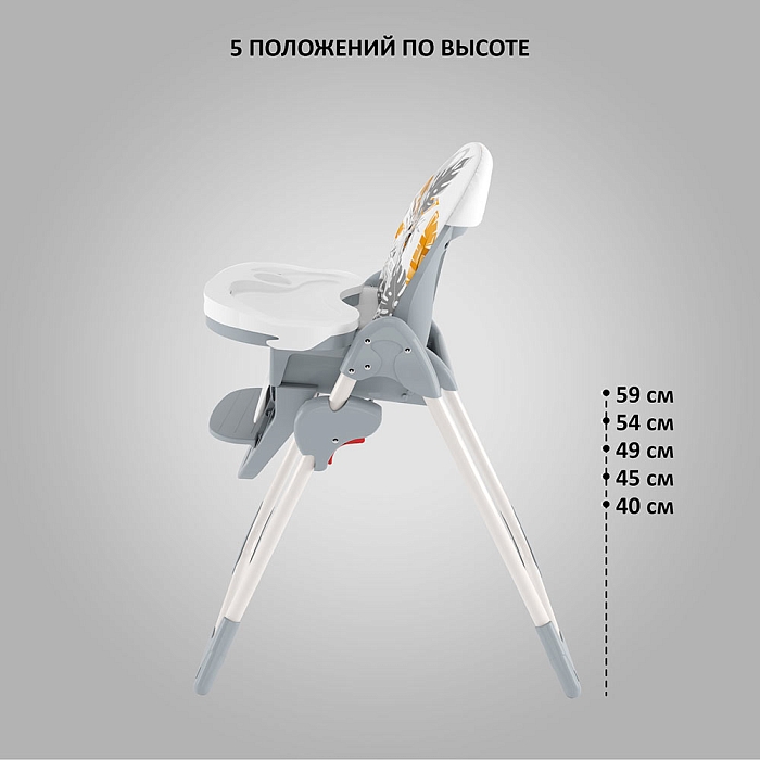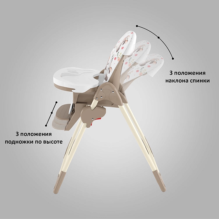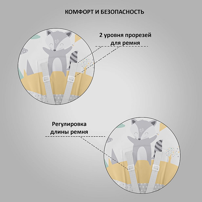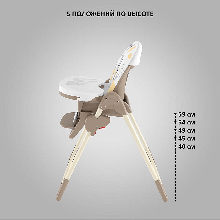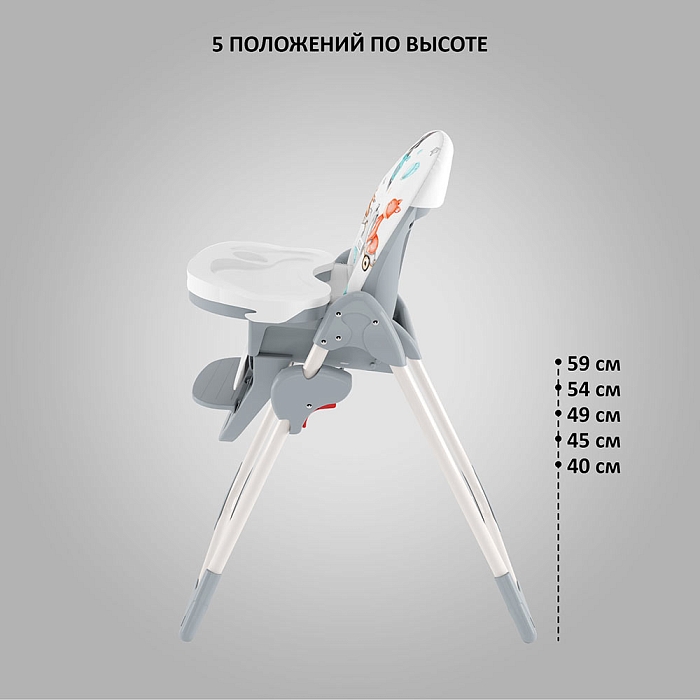Немаловажной деталью для комфорта является и 3 положения для опоры ног и 5-ти точечный ремень фиксации, который обеспечит Вашему ребенку безопасность, а дополнительный упор не позволит ему съезжать вниз во время игры или еды.