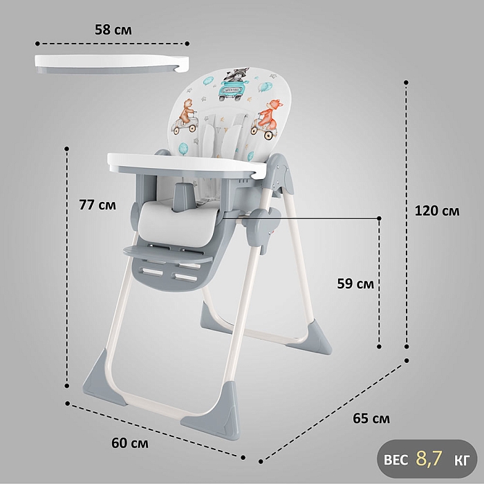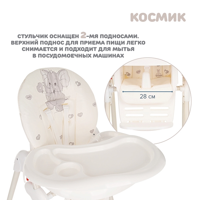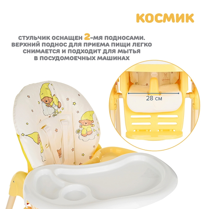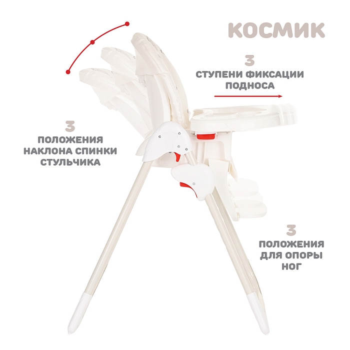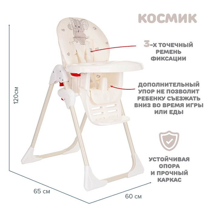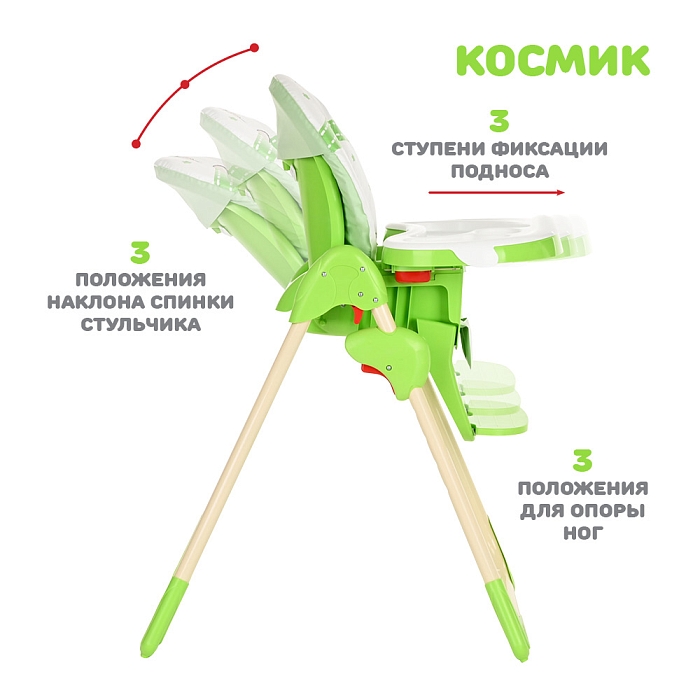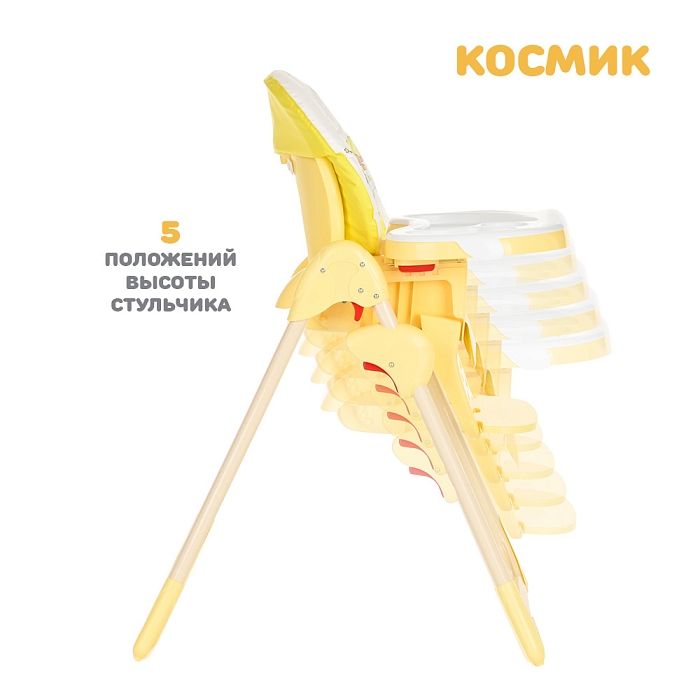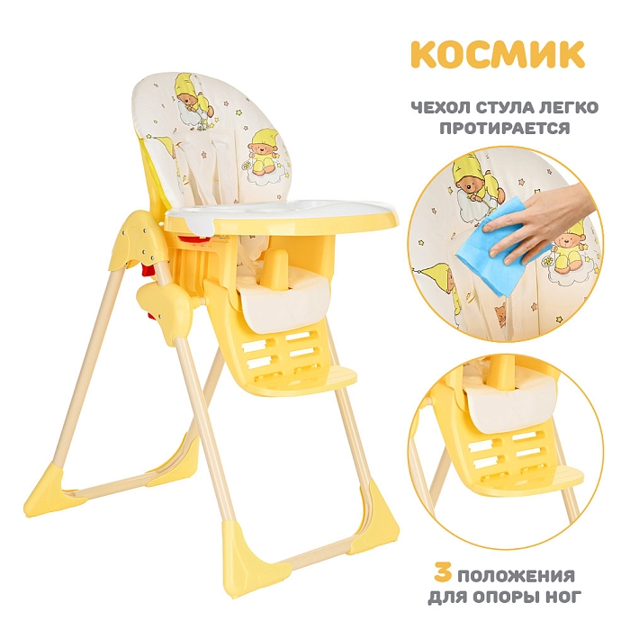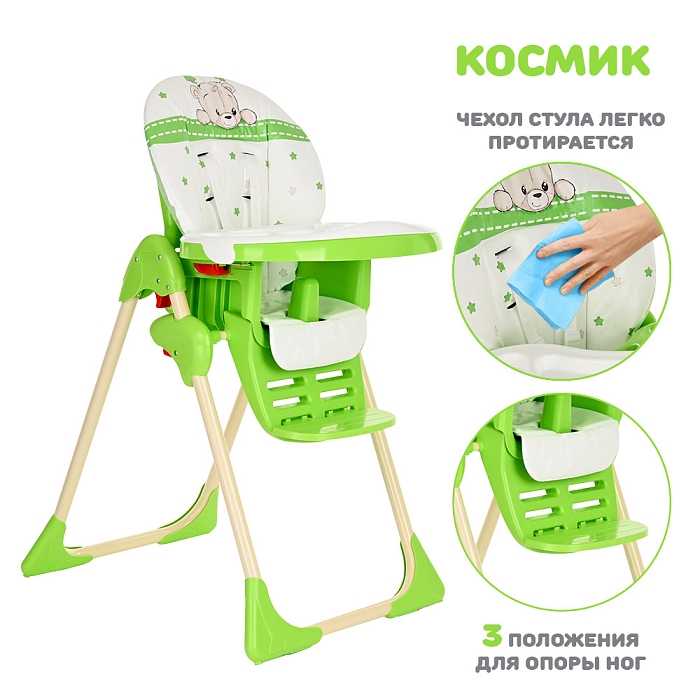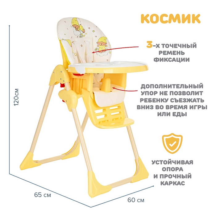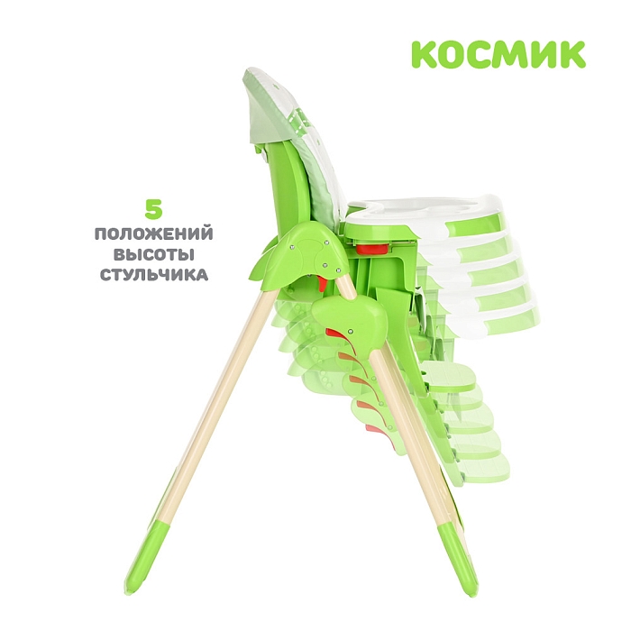 Стульчик для кормления Космик — большой и очень функциональный предмет детской мебели на кухне. Родители найдут в нем надежного и верного помощника во время кормления и игр ребенка. У него просторное сиденье с мягкой подкладкой, а также огромный легко моющийся пластиковый поднос.
