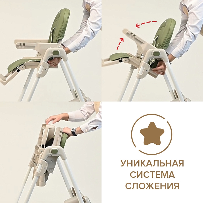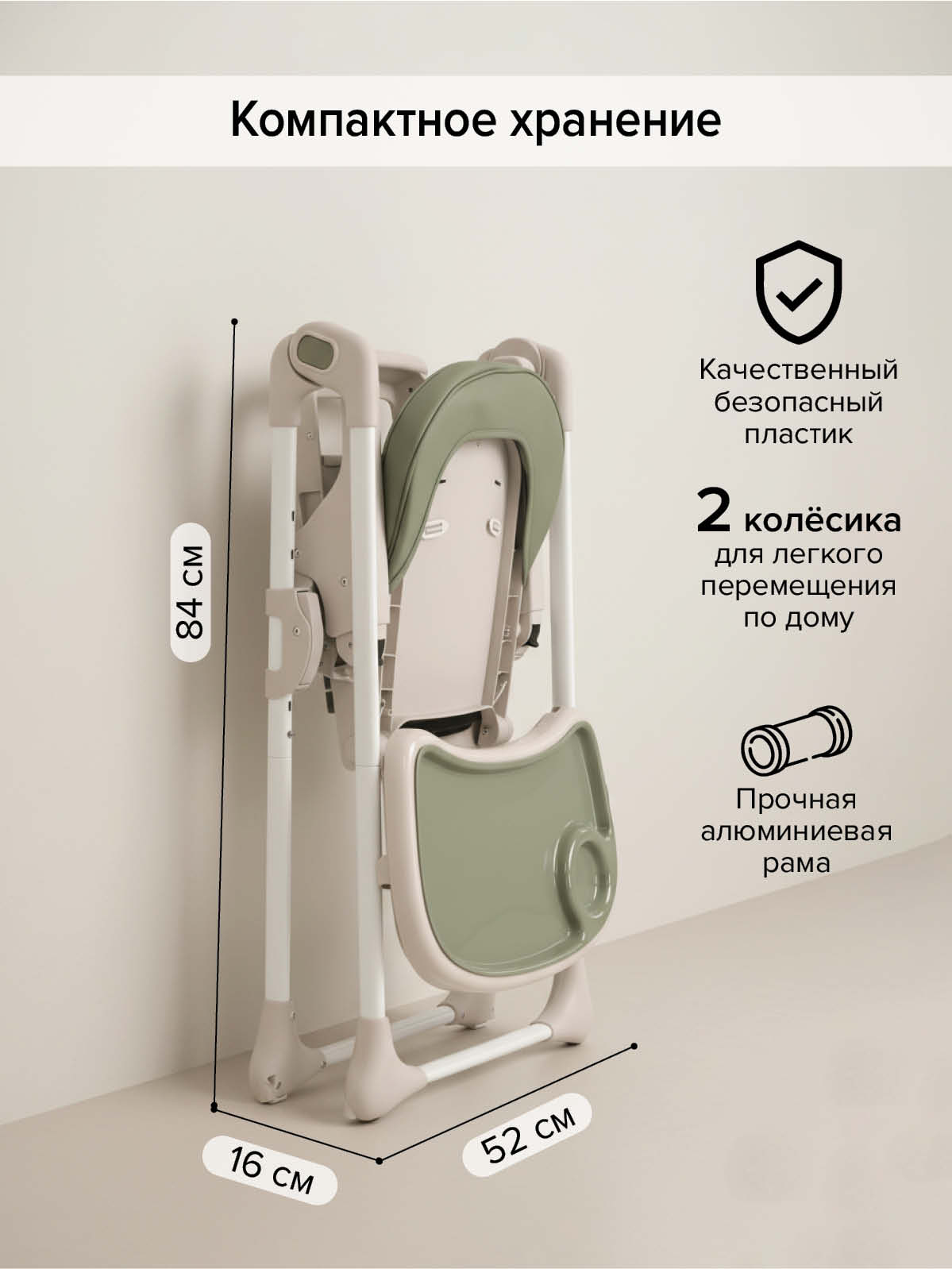 Современная эргономичная форма прекрасно впишется в любой интерьер. Стульчик оснащен 2 колесиками на задних ножках. Отличительная особенность данной модели удобное и быстрое сложение одной кнопкой, модель очень компактная и удобная в быту, не занимает много места в сложенном виде, а с помощью колесиков легко перемещать по комнате.