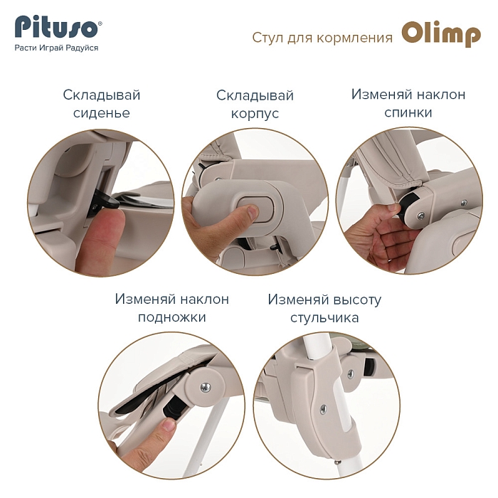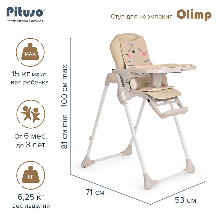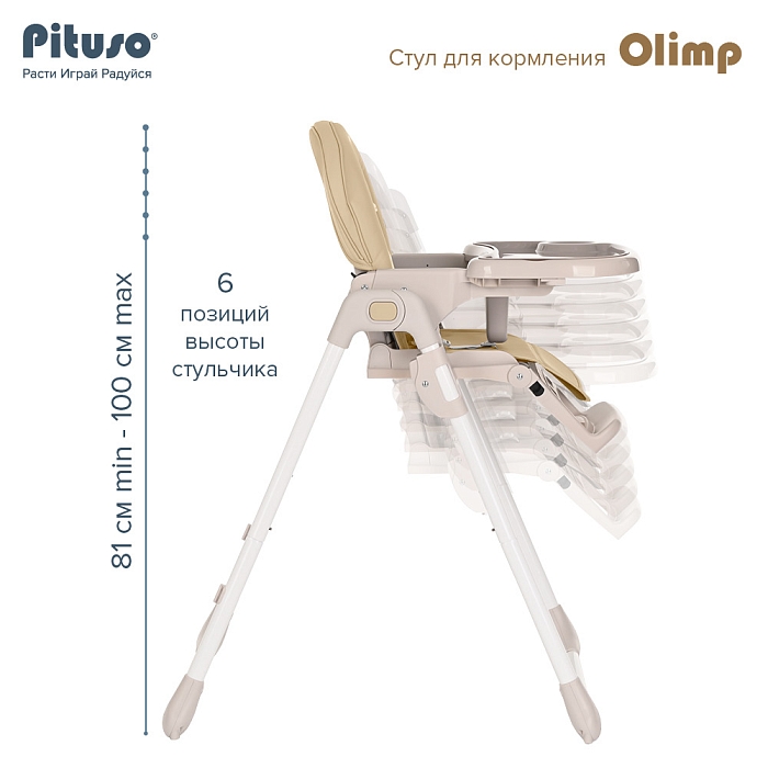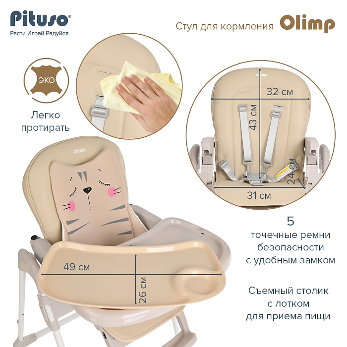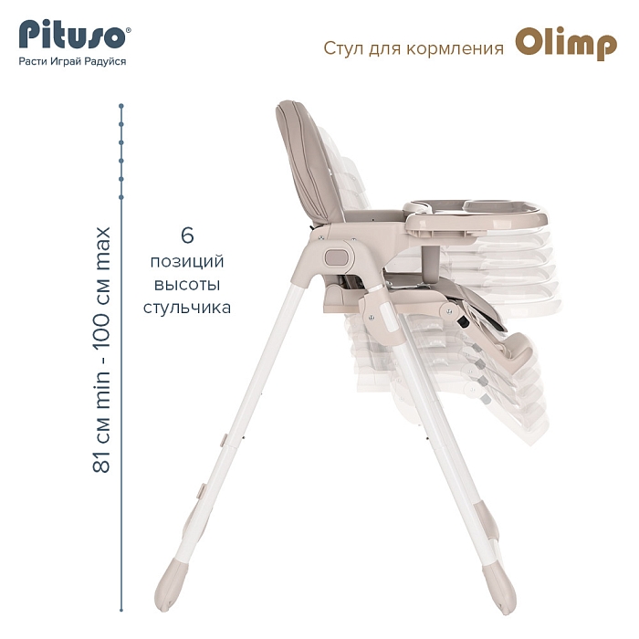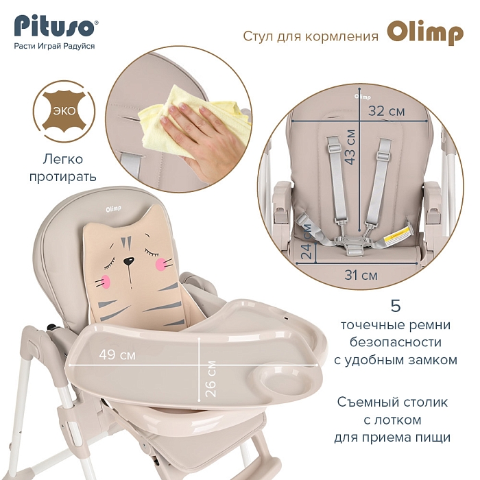 Съемный столик подгоняется в наилучшее положение для кормления, а лоток для приема пищи легко моется. Высоту стульчика Pituso Olimp можно настроить в 7 положениях. Пятиточечные страховочные ремни безопасности позволят весело проводить время с малышом, не опасаясь, что он вывалится наружу. Свободно регулируемый угол наклона спинки в 3-х положениях и 3-х ступенчатая регулировка подножки позволит ребенку сладко вздремнуть после приема пищи.