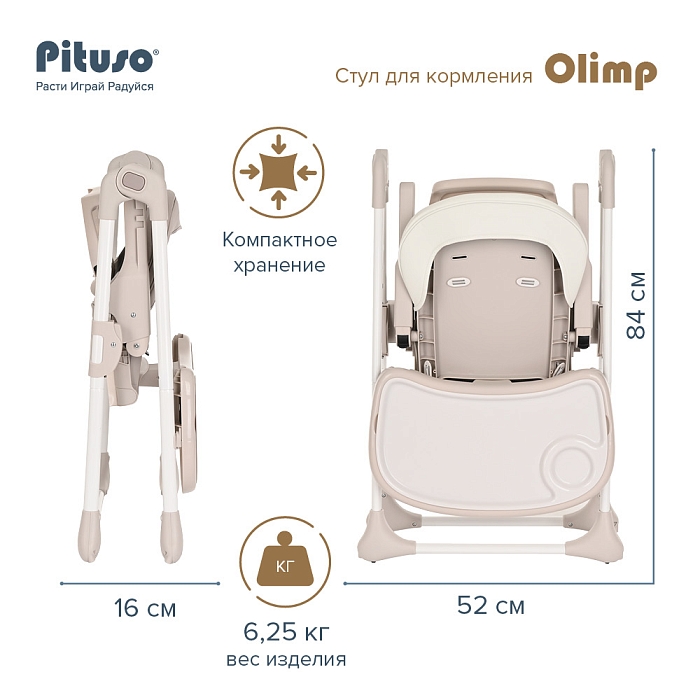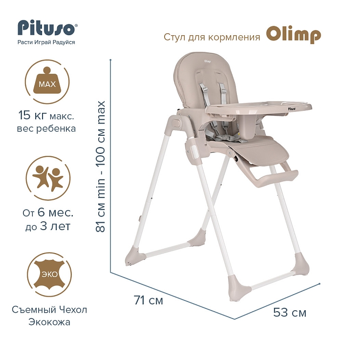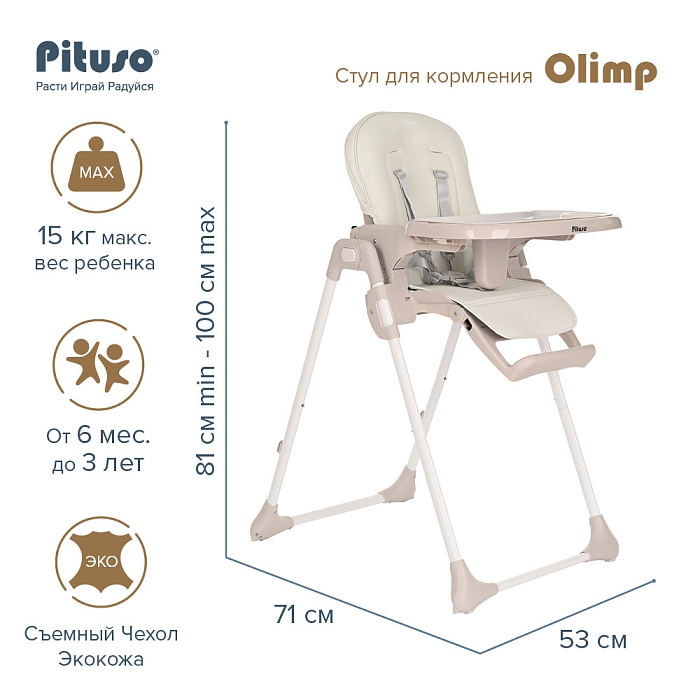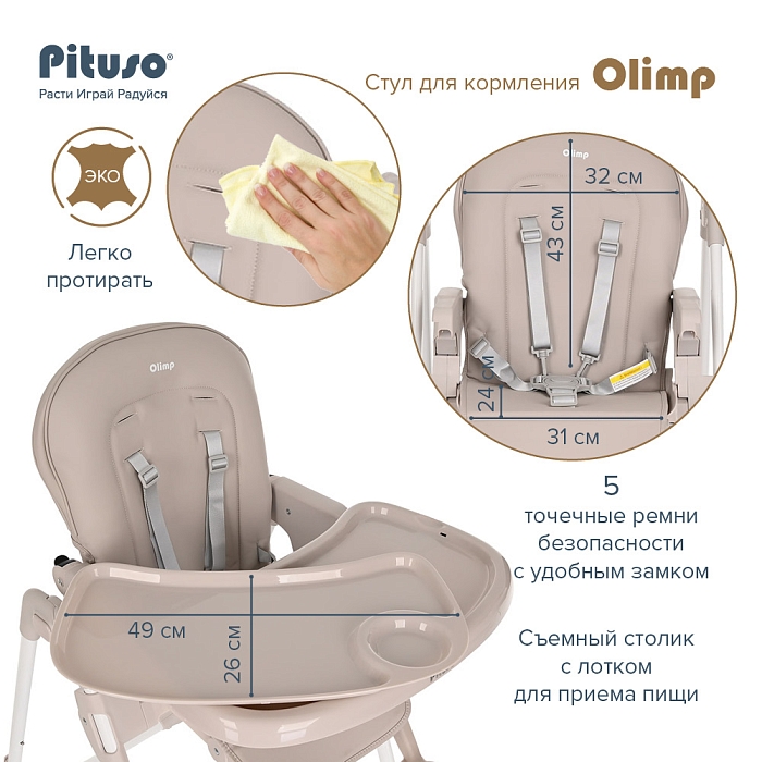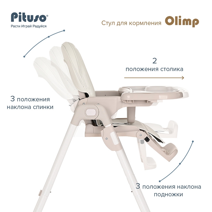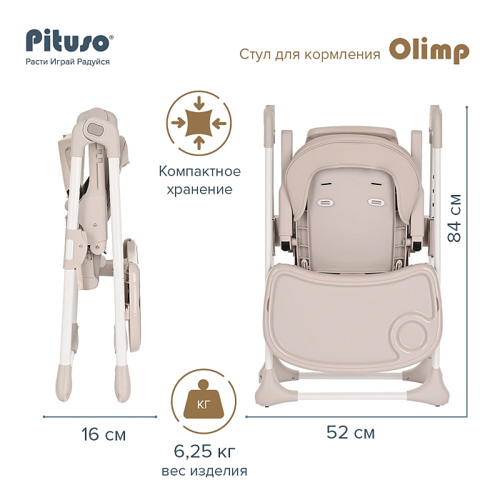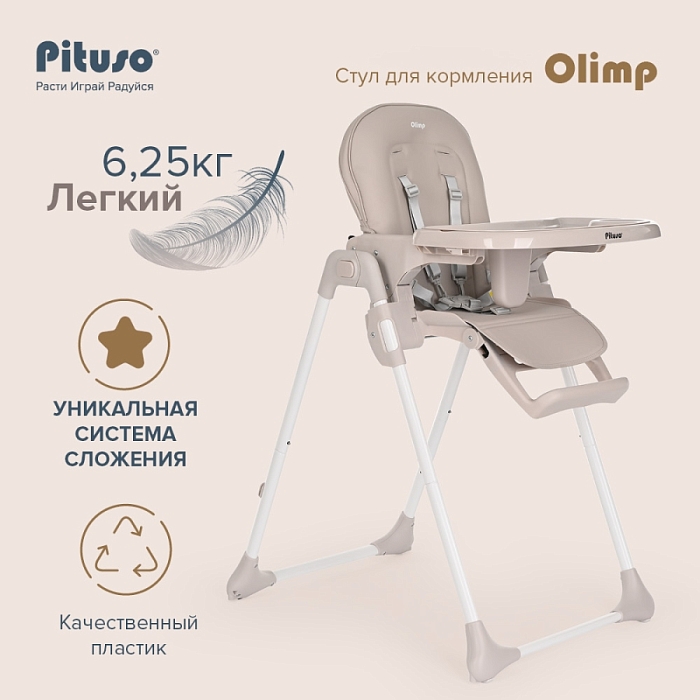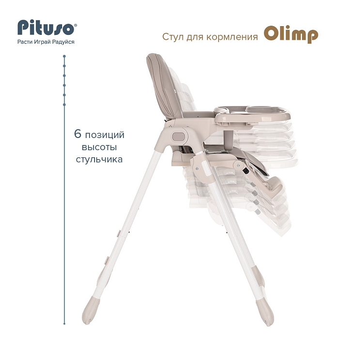 Стульчик Pituso OLIMP функциональный и удобный стульчик для кормления. Алюминиевая рама создает устойчивость и надежность, а задние колесики оснащены педалью тормоза. Безопасная конструкция с мягким сидением легко чистится и компактно складывается. Съемный столик подгоняется в наилучшее положение для кормления, а лоток для приема пищи легко моется. Высоту стульчика Pituso OLIMP можно настроить в 7 положениях. Пятиточечные страховочные ремни безопасности позволят весело проводить время с малышом, не опасаясь, что он вывалится наружу. Свободно регулируемый угол наклона спинки в 3-х положениях и 3-х ступенчатая регулировка подножки позволит ребенку сладко вздремнуть после приема пищи. Современная эргономичная форма прекрасно впишется в любой интерьер. Стульчик оснащен 2 колесиками на задних ножках. Отличительная особенность данной модели удобное и быстрое сложение одной кнопкой, модель очень компактная и удобная в быту, не занимает много места в сложенном виде, а с помощью колесиков легко перемещать по комнате.