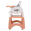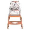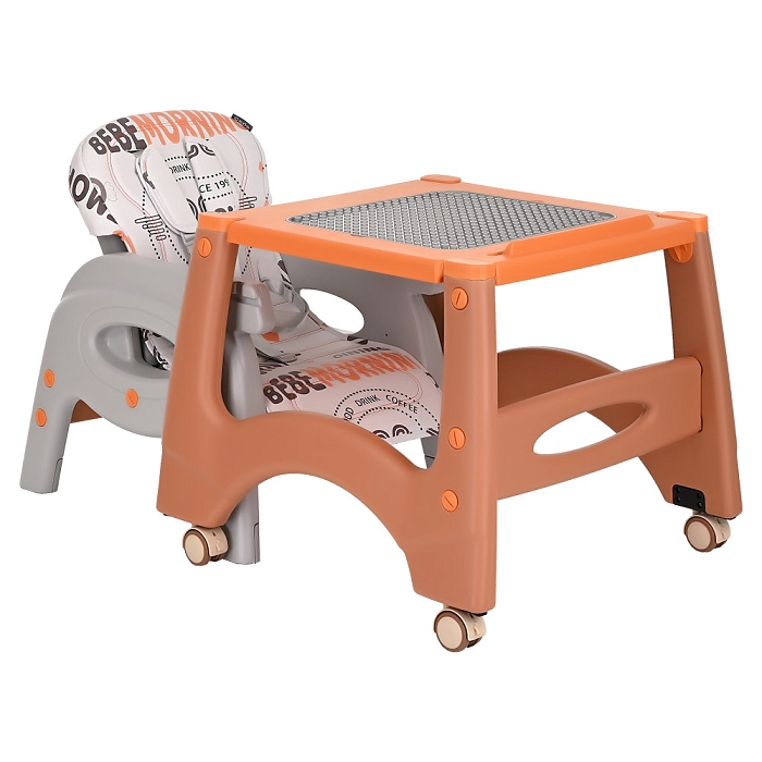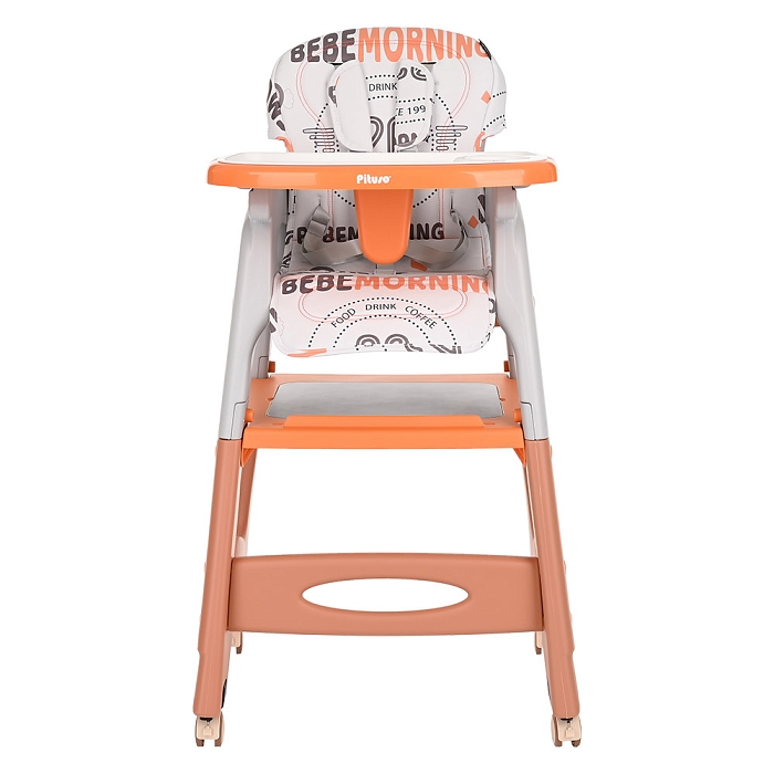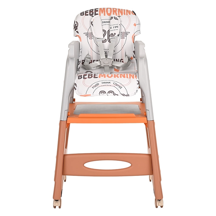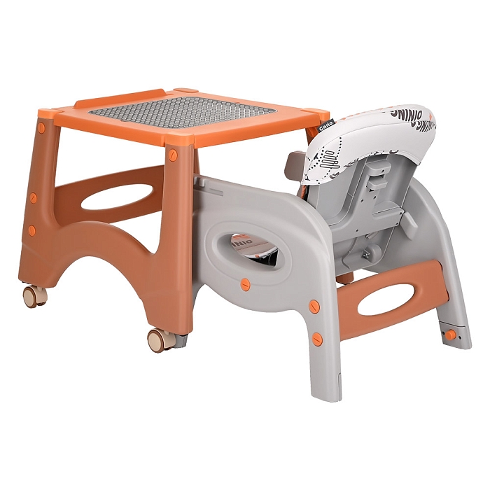 В собранном виде может быть высоким стульчиком для кормления со съемным регулируемым столиком и 5-точечными страховочными ремнями безопасности.