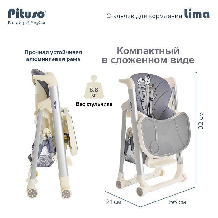 Pituso Lima – функциональный и удобный стульчик для кормления. Алюминиевая рама создает устойчивость и надежность, а задние колесики оснащены педалью тормоза. Безопасная конструкция с мягким сидением из качественной ECO-кожи легко чистится и компактно складывается. Съемный столик подгоняется в наилучшее положение для кормления, а лоток для приема пищи отлично моется в посудомоечной машине. Высоту стульчика Pituso Lima можно настроить в 6 положениях. Пятиточечные страховочные ремни безопасности позволят весело проводить время с малышом, не опасаясь, что он вывалится наружу. Свободно регулируемый угол наклона спинки и 3-х ступенчатая регулировка подножки позволит ребенку сладко вздремнуть после приема пищи. В корзину можно положить игрушки, чтобы они всегда были под рукой. Современная эргономичная форма прекрасно впишется в любой интерьер.