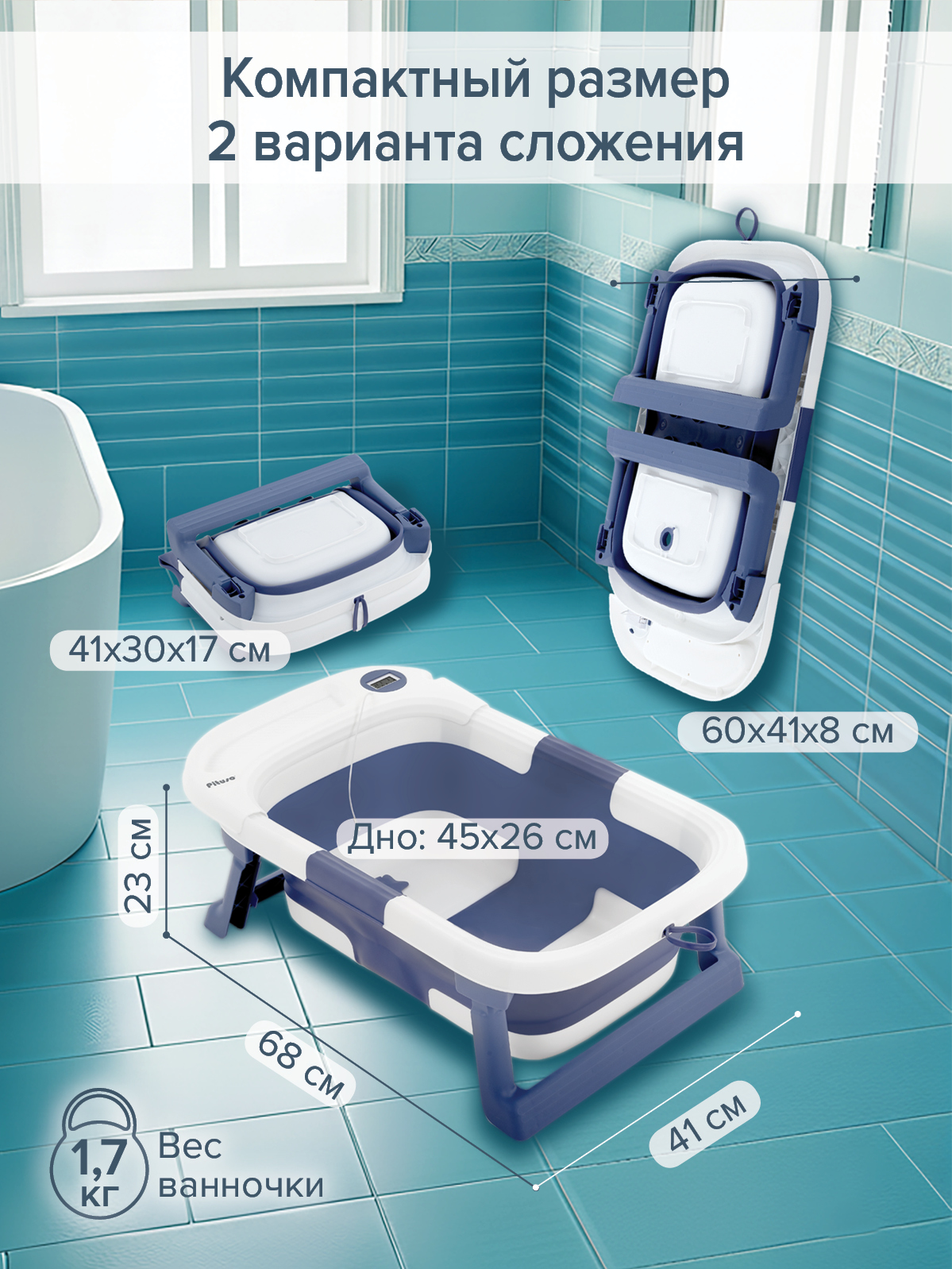 Размер ванночки в сложенном виде: 60х41х8 см, второе сложение - 41х30х17 см