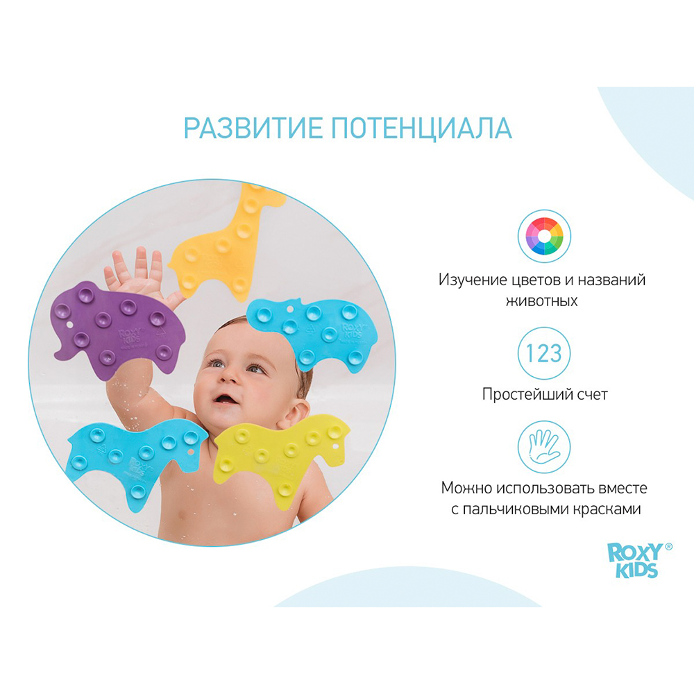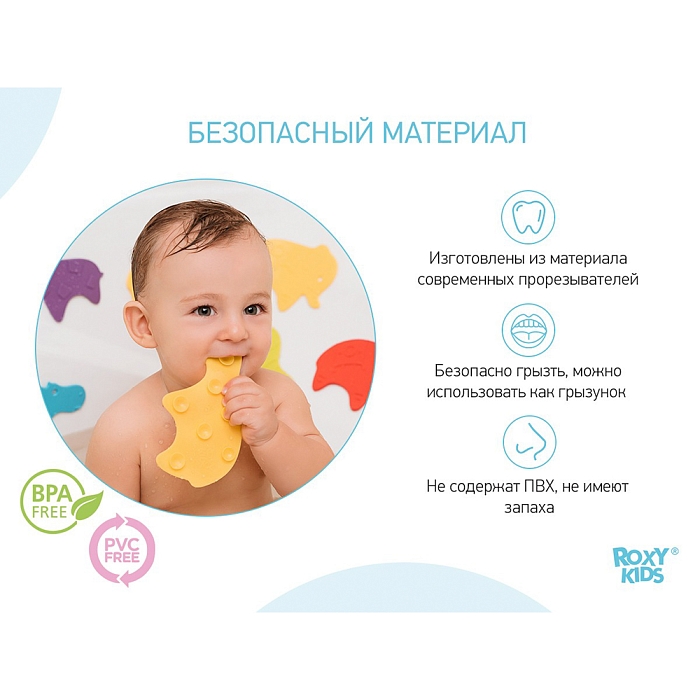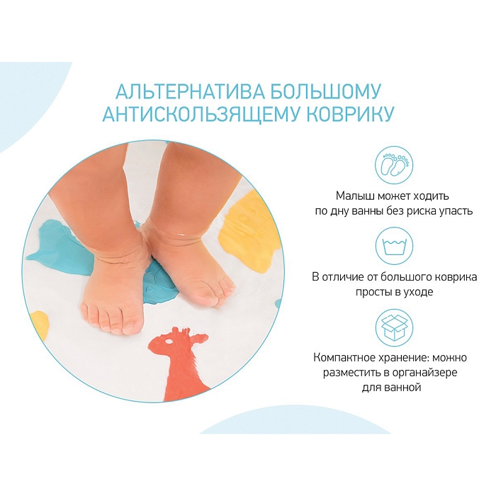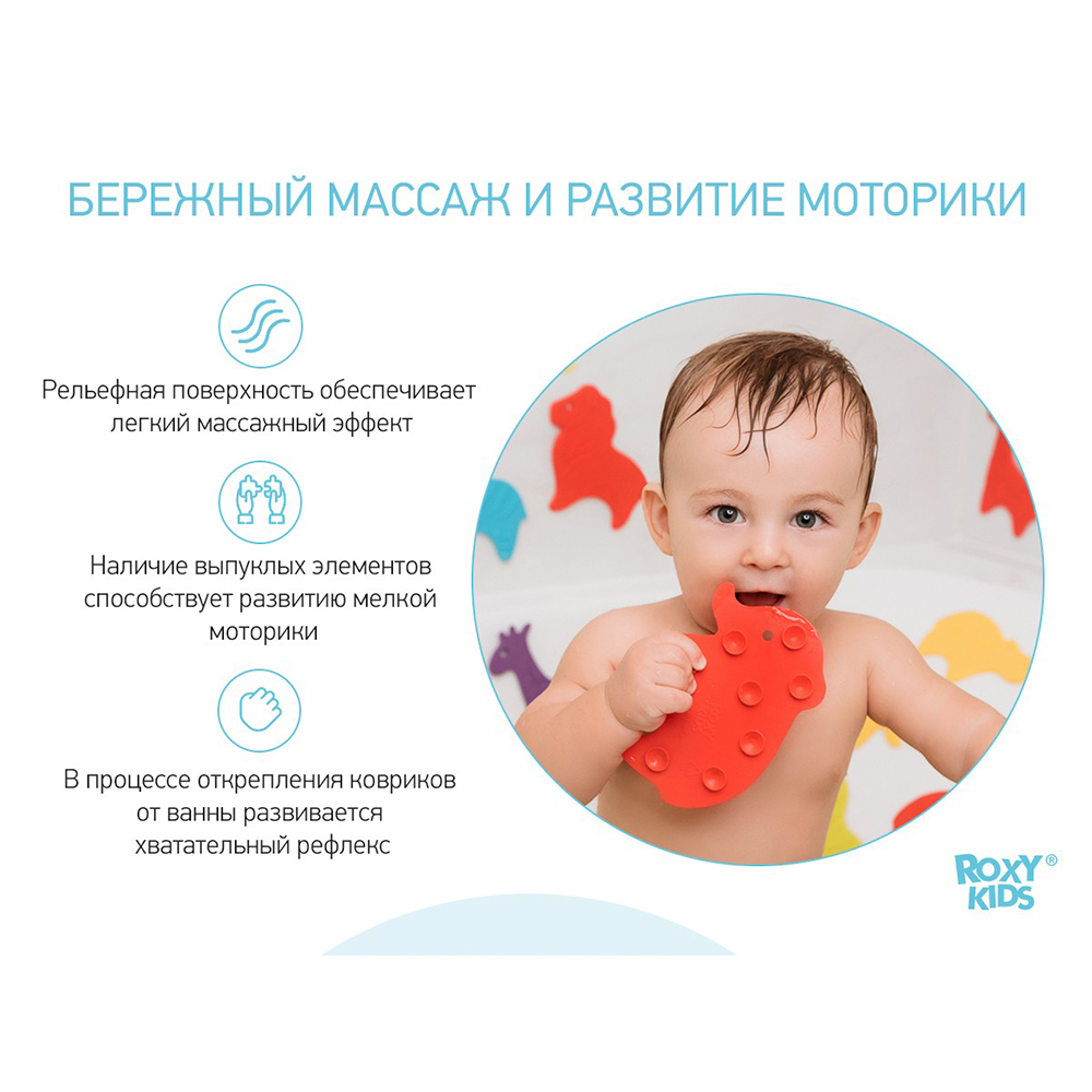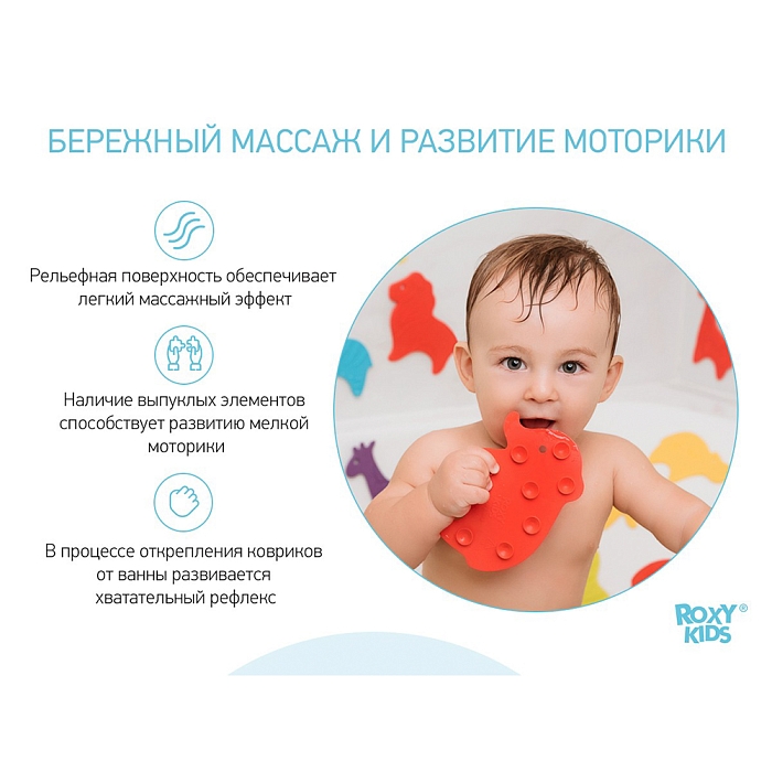 Мини коврики для ванной SAFARI от ROXY-KIDS произведены в России из современного и безопасного материала ТЭП. Этим коврикам можно найти множество применений. Мини-коврики станут отличной заменой большому коврику, который неудобно промывать и сушить. Также их используют как массажеры, потому что рельефная поверхность обеспечивает бережный массаж стоп и ладоней. Ребенок может грызть их, потому что они изготовлены из специального безопасного материала. Ими можно также украсить интерьер, налепив коврики на дно и стенки ванны или кафель, чтобы не только обеспечить удобство, но и расставить яркие цветовые акценты. Кроме того, эти мини-коврики абсолютно не пахнут, потому что не содержат ПВХ. Для ухода их достаточно просто периодически промывать с мылом, полоскать и хорошо сушить. Они легко и надежно крепятся с помощью присосок на любую гладкую поверхность, при этом не оставляют следов. В ассортименте есть несколько наборов ковриков.
