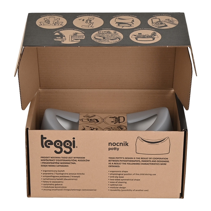 Детский горшок TEGGI. Надежное и устойчивое нескользящее основание подарит ребенку чувство безопасности во время пользования горшком. Благодаря инновационной форме ребенок легко садится и встает в удобном и оптимальном положении тела, максимально приближенном к естественному. Симметричная форма изделия позволяет ребенку интуитивно найти наиболее удобное положение. Благодаря компактной форме горшок занимает очень мало места. Его легко носить с собой, вы можете просто взять его с собой в поездку в автомобиле или положить под коляску, отправляясь на прогулку. Цвета подобраны в соответствии с современными тенденциями, так что горшок может стать неотъемлемой частью вашего дома. Его модульная конструкция облегчает опорожнение и очистку. Горшок Teggi – идеальное решение для каждого родителя, который хочет поддержать своего ребенка в обучении самостоятельности.